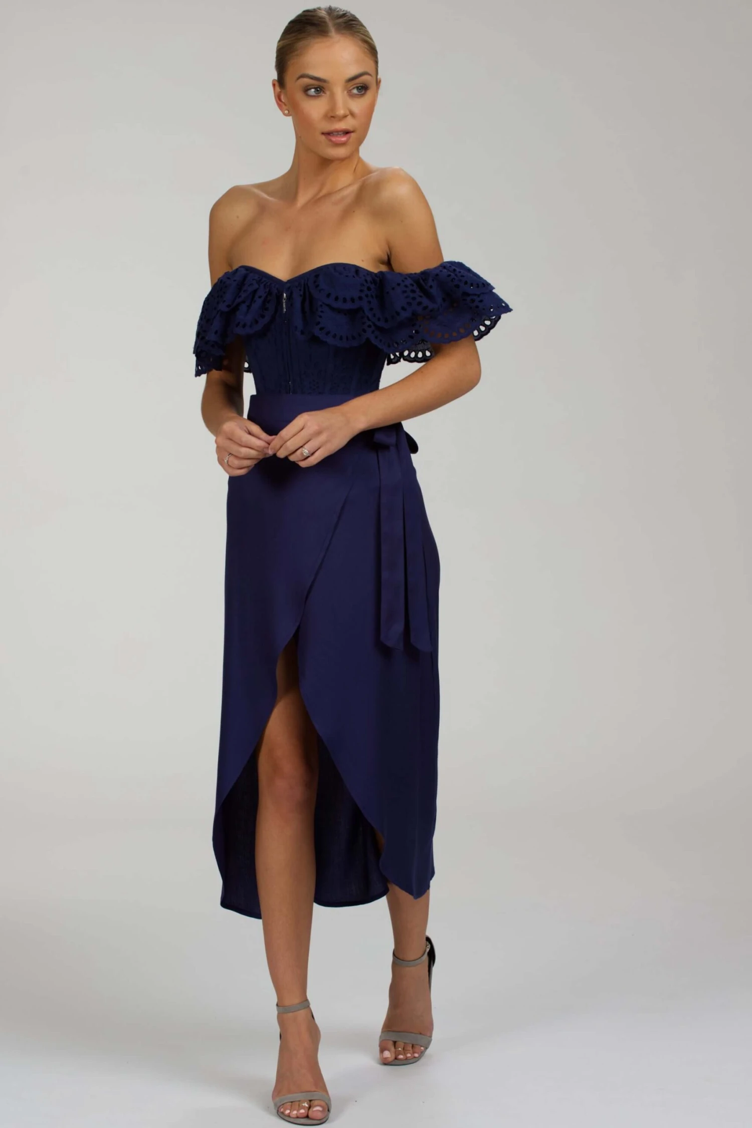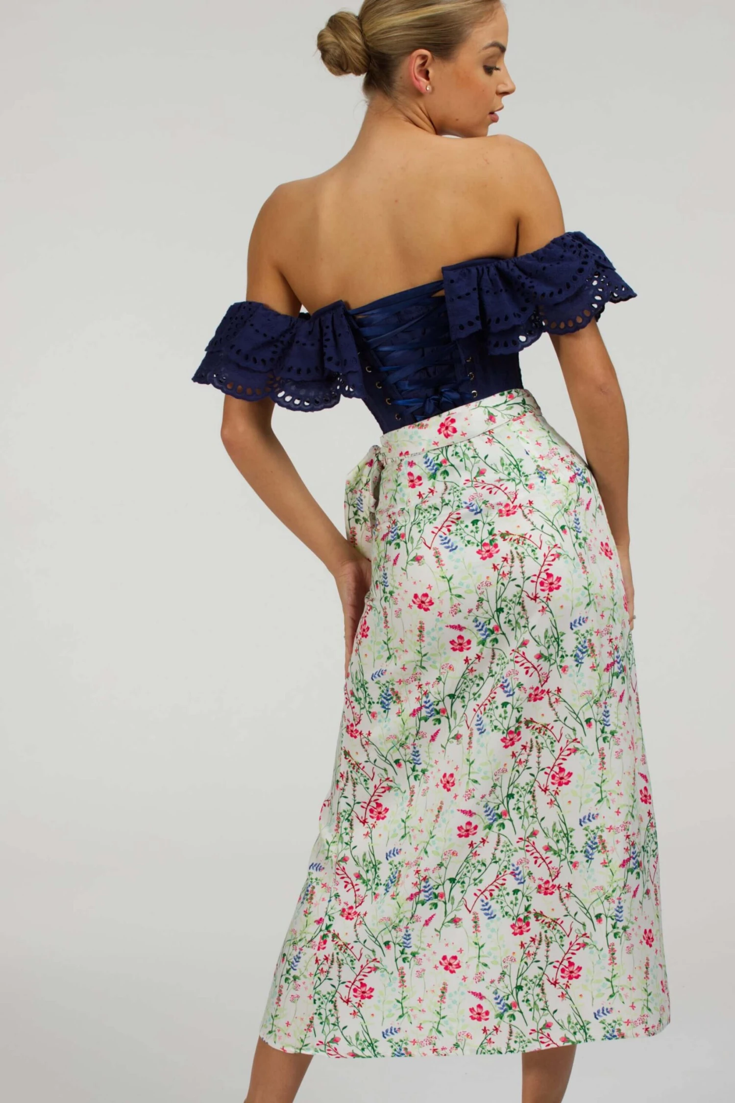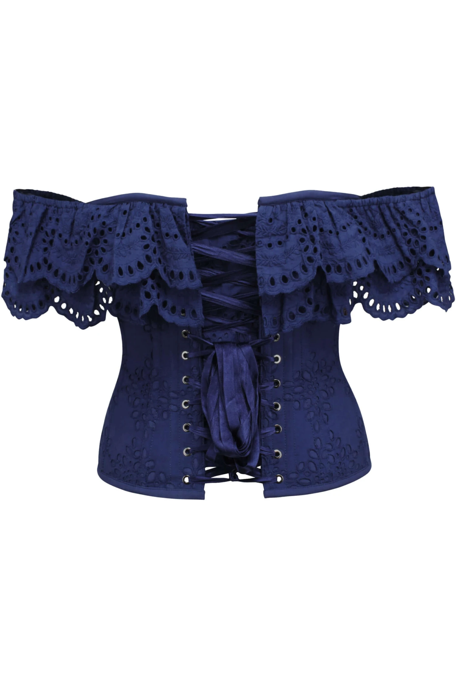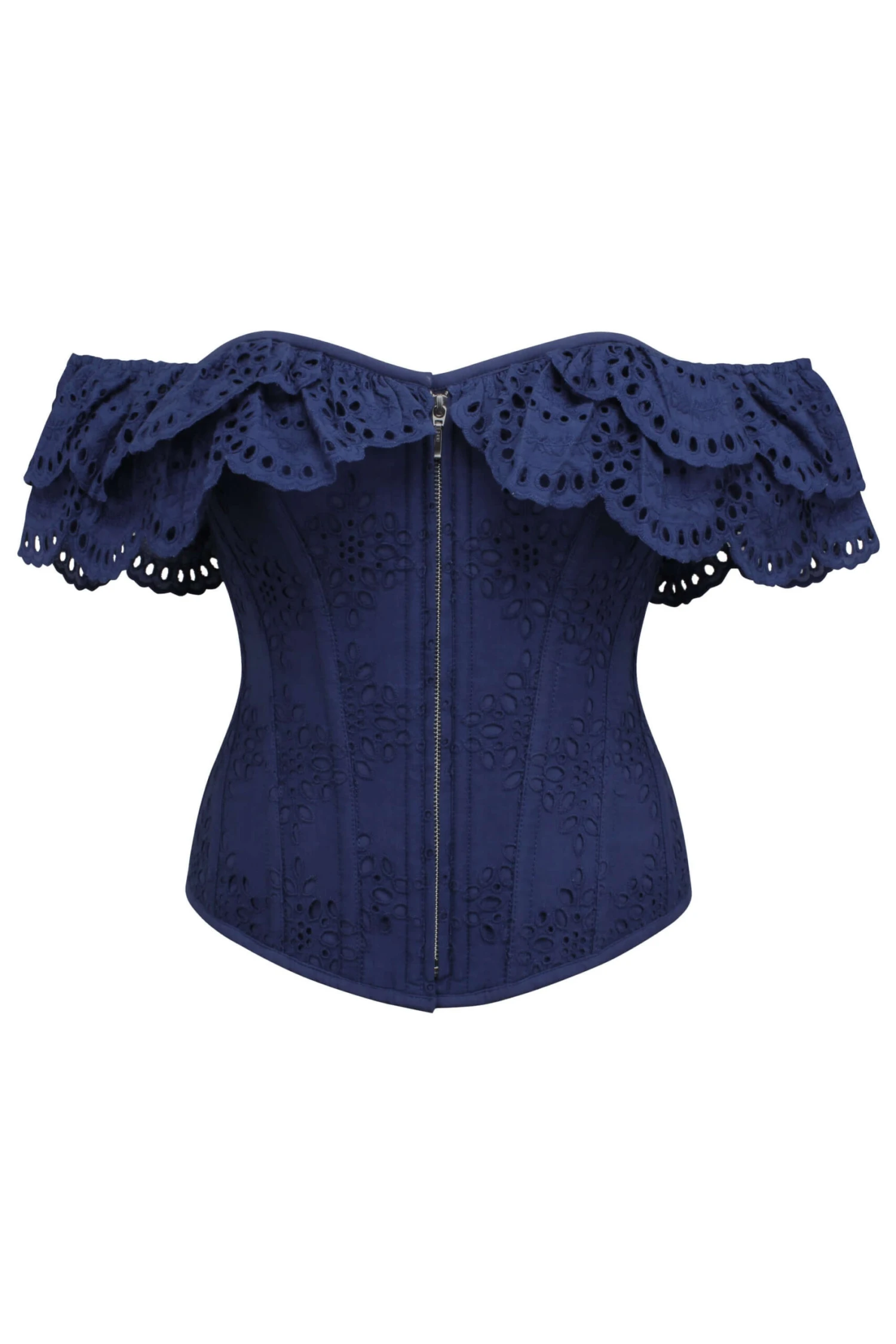 Navy is the new black! This elegant summer corset top is the perfect mix of soft casual cotton and timeless broderie anglaise embroidery. The deep scalloped bardot frill elevates a simple overbust into something truly special. It’s easy to fasten with the concealed front fastening zip and fully adjustable via the beautiful ribbon lacing at the back. Pair with denim to dress it down or match with an elegant wrap skirt to elevate your look for evening wear and summer events. Add our detachable Dahlia strap to provide further coverage and support.