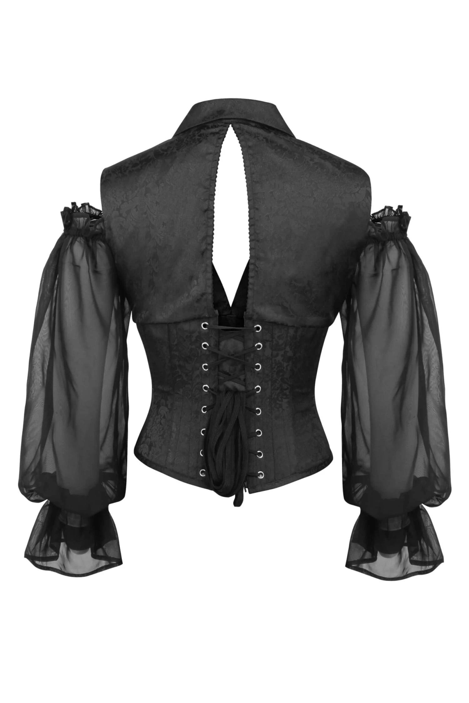 Enjoy all the features you can wish for in a corset, with this beautiful and luxurious Black Brocade Underbust Corset Top. The long chiffon sleeves will give you some coverage, while decorating your arms with their ruffles, and the cold shoulder and back cut-out elements will add a touch of flirt. The corset also comes with a front zip , which is a great addition for anyone who is new to corsetry.