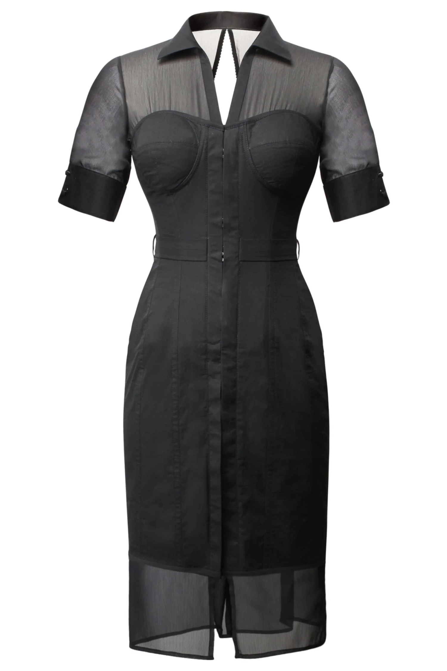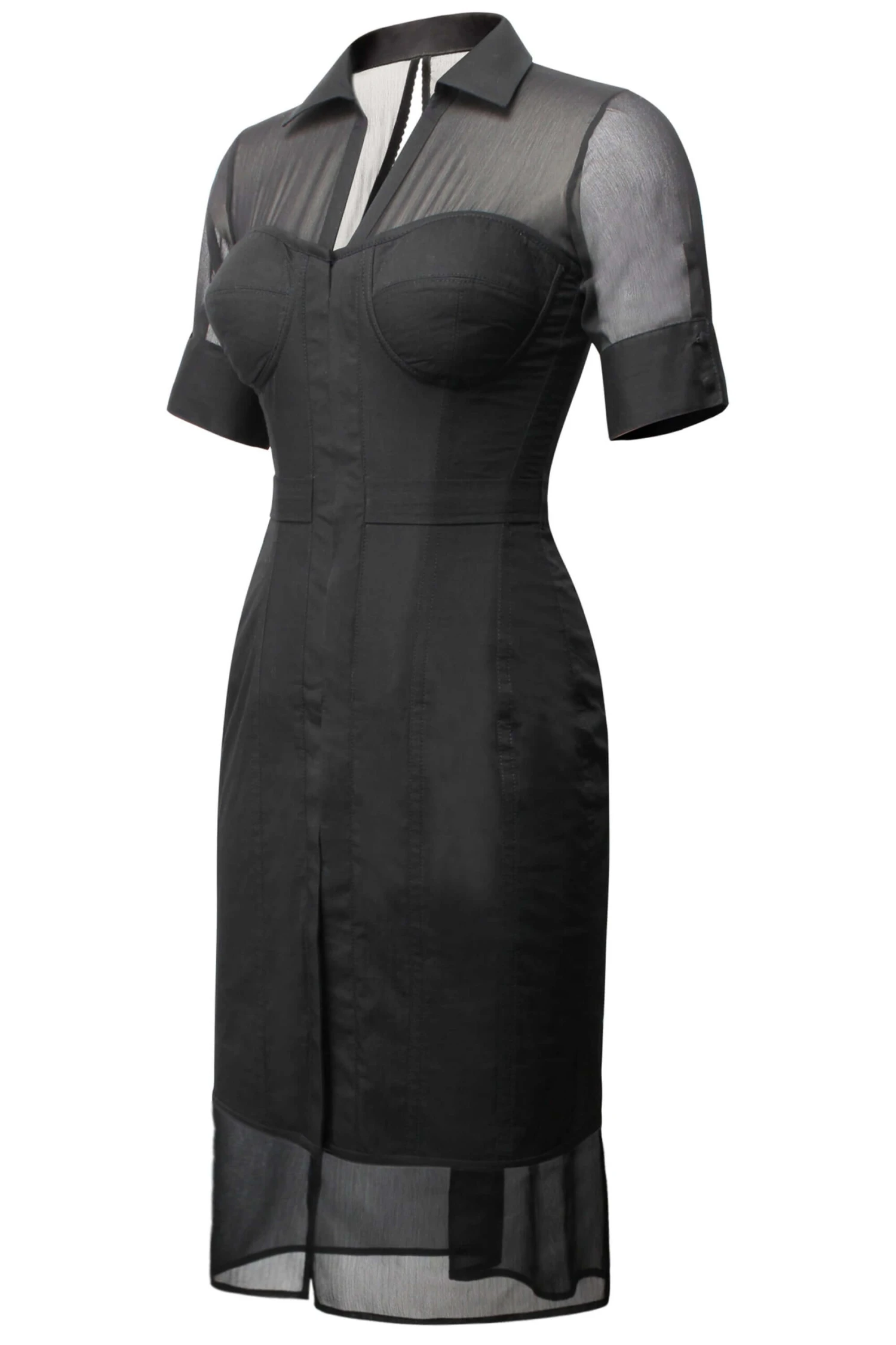 Our sophisticated shirt dress is a must-have for both your work and play wardrobe. A little black dress designed with versatility in mind, this piece means business with a formal collar and maximum bust support, and can take you through the night with its elegant matching sheer trim and sleeve detail. With no need for a bra underneath, this all-rounder also offers a waist reduction of up to 4β
