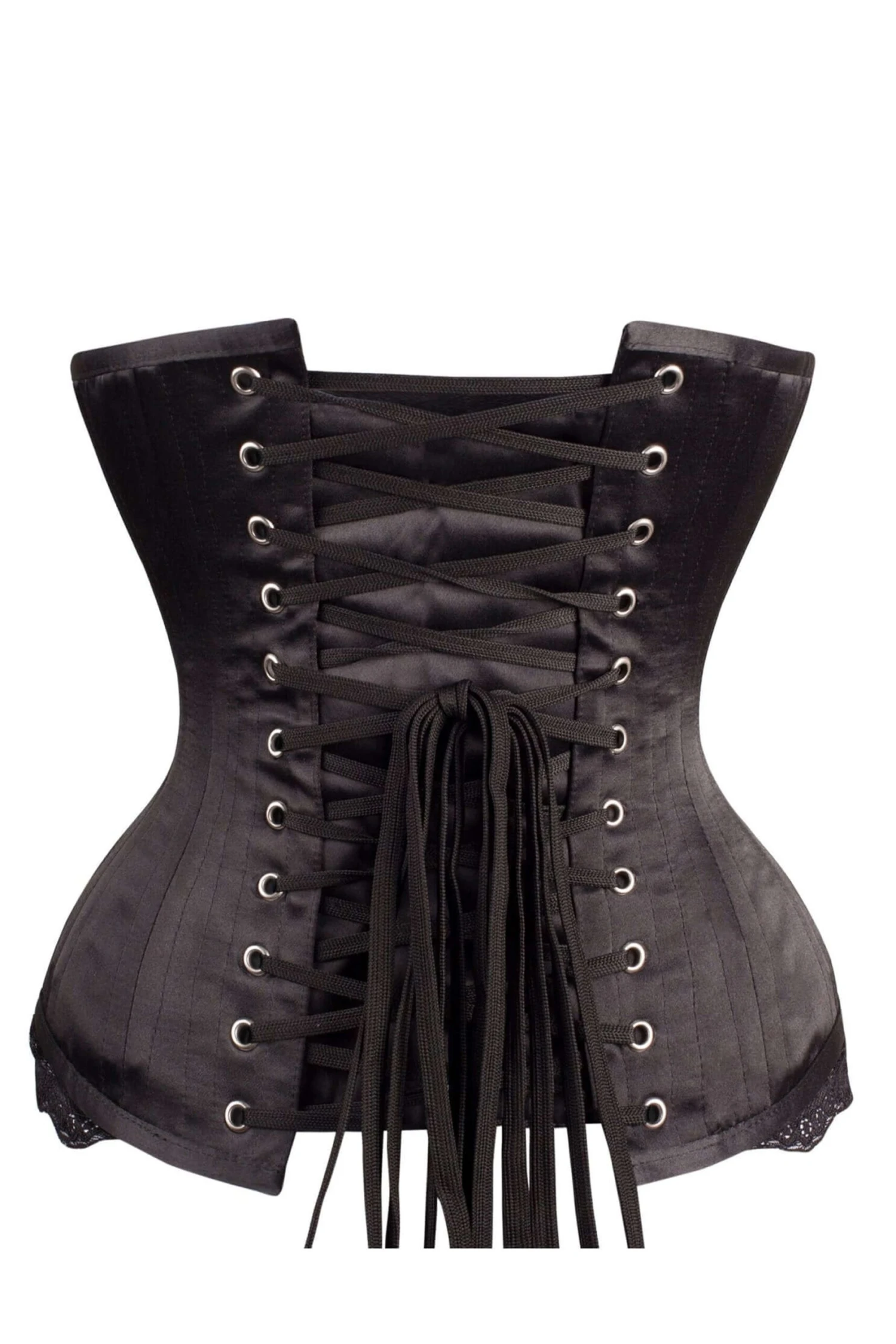 Dark Victorian inspired black satin underbust with double spiral steel boning for the ultimate waist reduction and body smoothing. Achieve up to 5″ waist reduction and a dramatic hourglass figure with this Expert Waist Training corset. Featuring a beautiful lace trim at the hem to sit over your hips and a panel on the front that is an attractive addition to a classic and simple shape. Our best fitting underbust to date, shaped at the top edge to fit under your bust with ribbon pretty ribbon ties at the centre front.