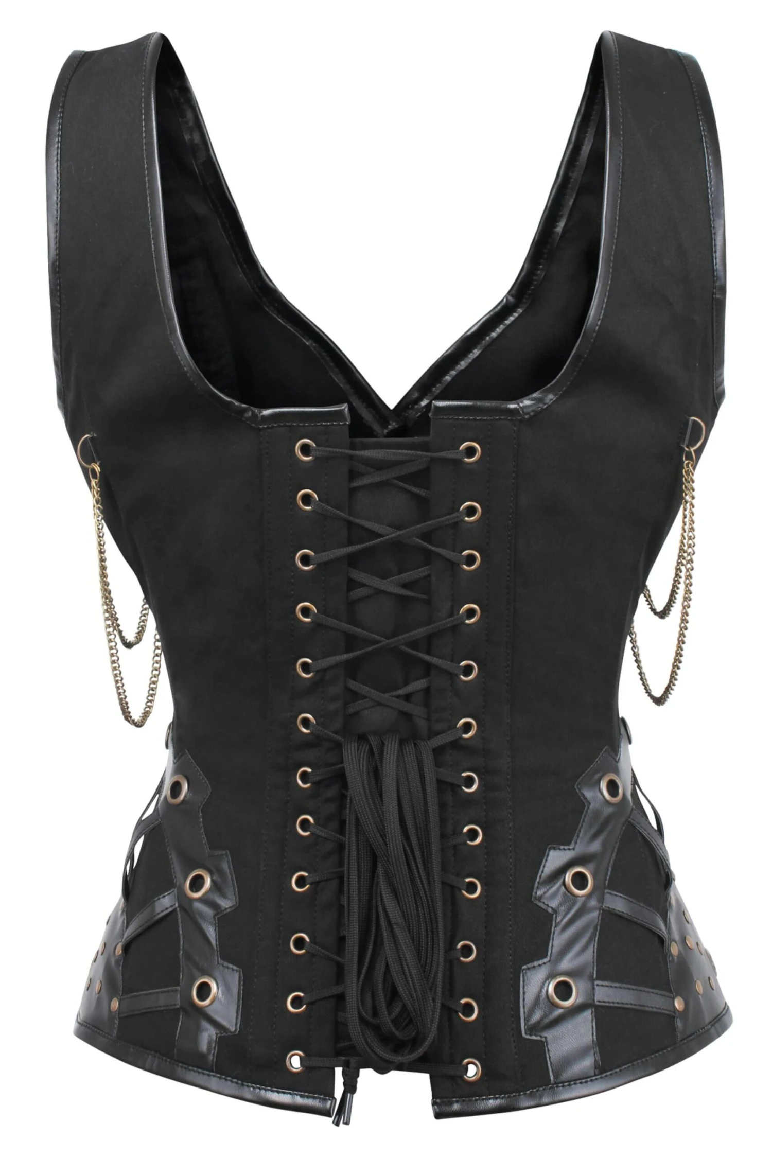 - Corset Design Features: Quilted Leatherette Straps, Buckle and Chains, Steampunk Latch Clips, Steampunk Appliqué with Eyelet and Press-studs, Hip Gores