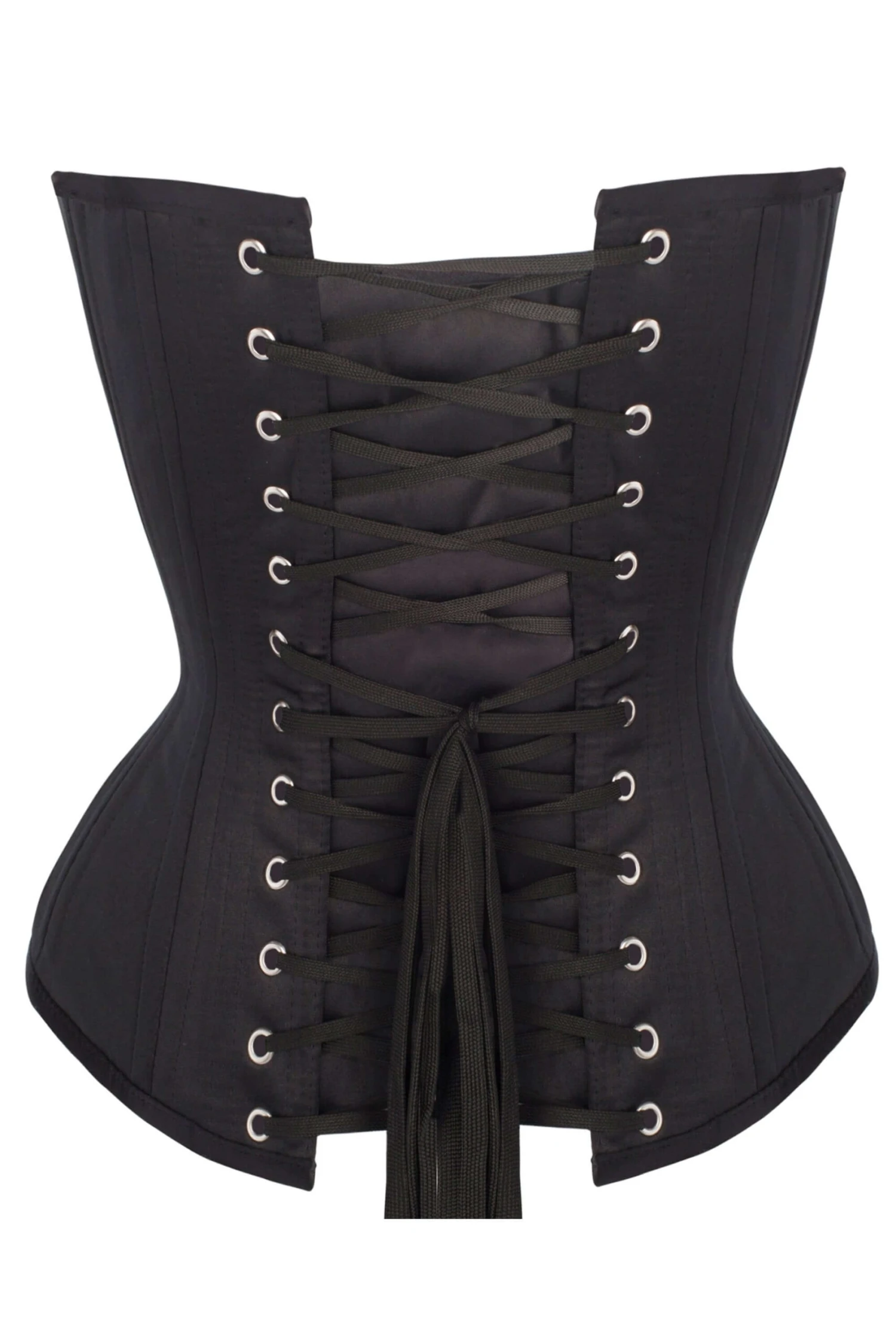 This magnificent black satin waist training underbust corset is made with the strongest spiral steel boning for the ultimate waist reduction and body shaping experience. It offers a potential 5″ reduction in waist size when laced at its tightest and is one of our elite range of waist training corsets. It can be worn either as an undergarment or as the centrepiece to an outfit. If you are unsure about waist training or have any questions, do not hesitate to contact us for advice.