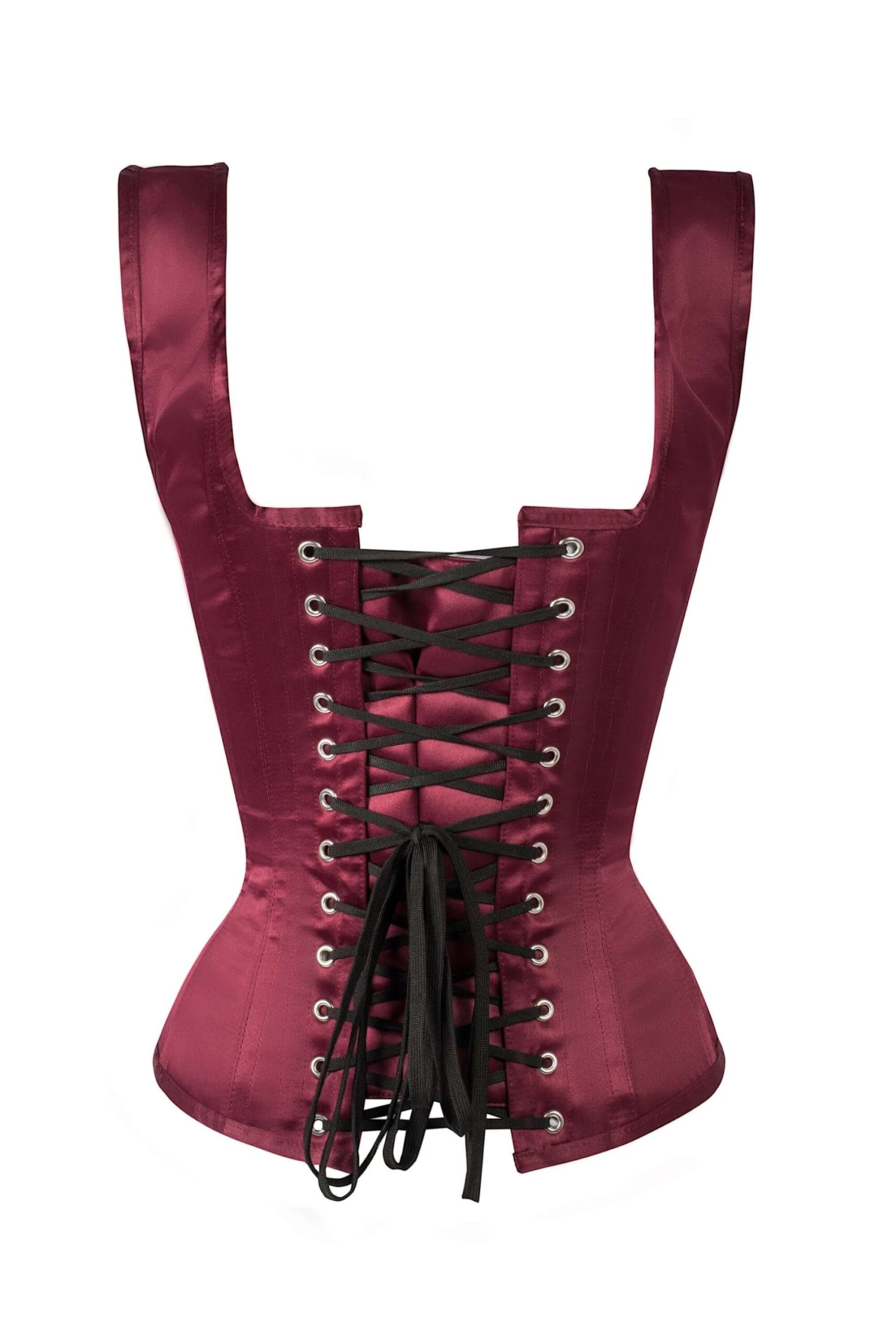- Corset Features: Cord Lacing,Hip Gores,Steel Busk,Shoulder Straps