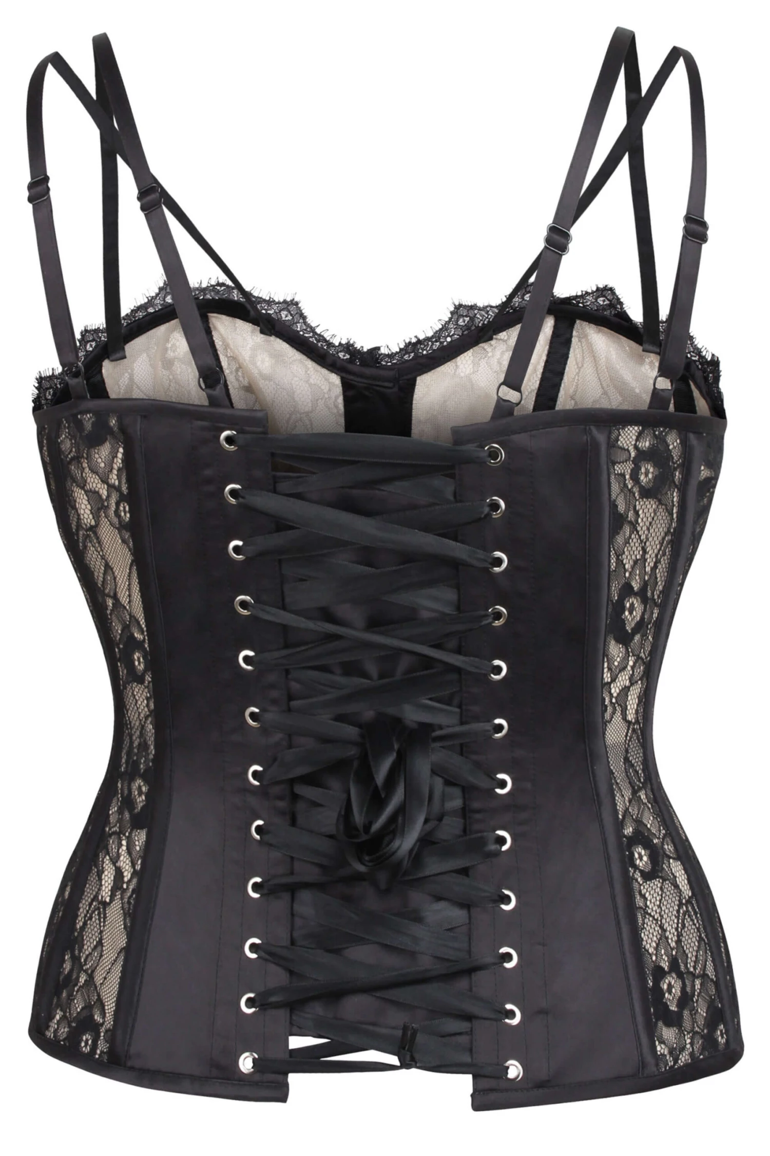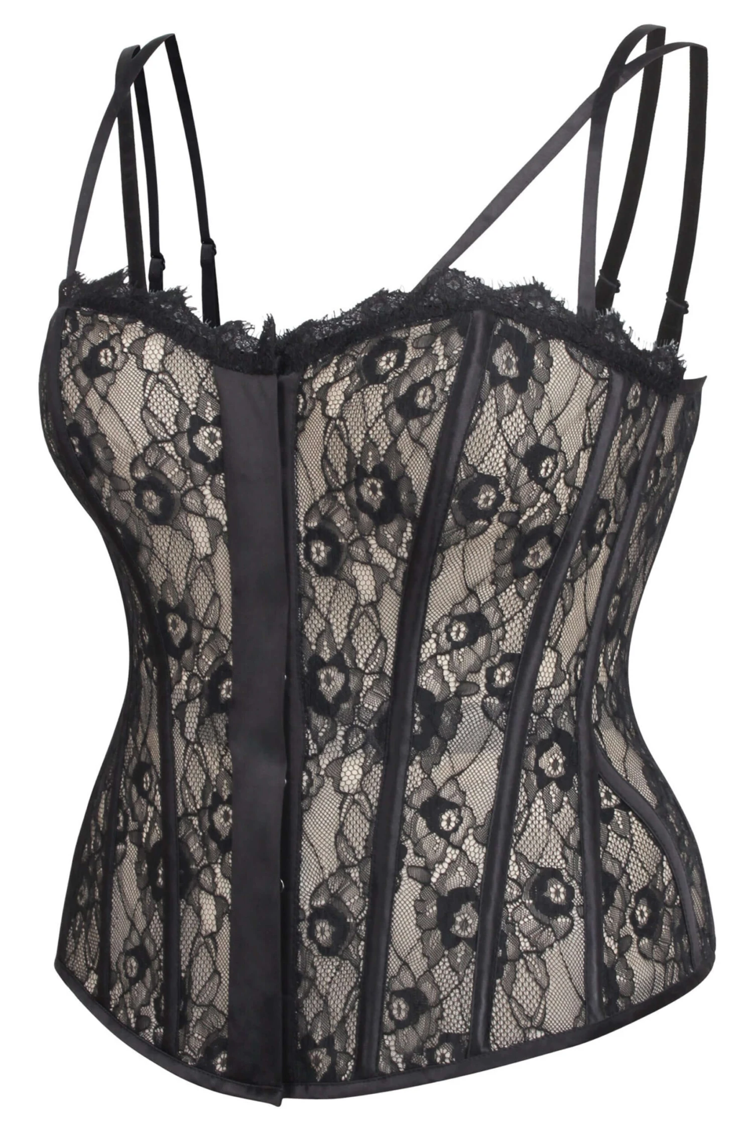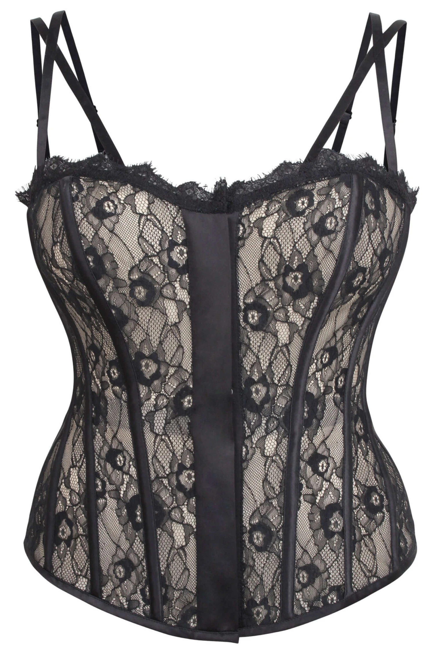 Clementine is the perfect corset for creating a seductive yet sophisticated outfit. Nude mesh overlaid with delicate floral lace and edged with a frill lace trim this corset is sure to turn some heads. The cross over straps are adjustable to fit you perfectly, finished with classic corset ribbon lacing and covered busk.