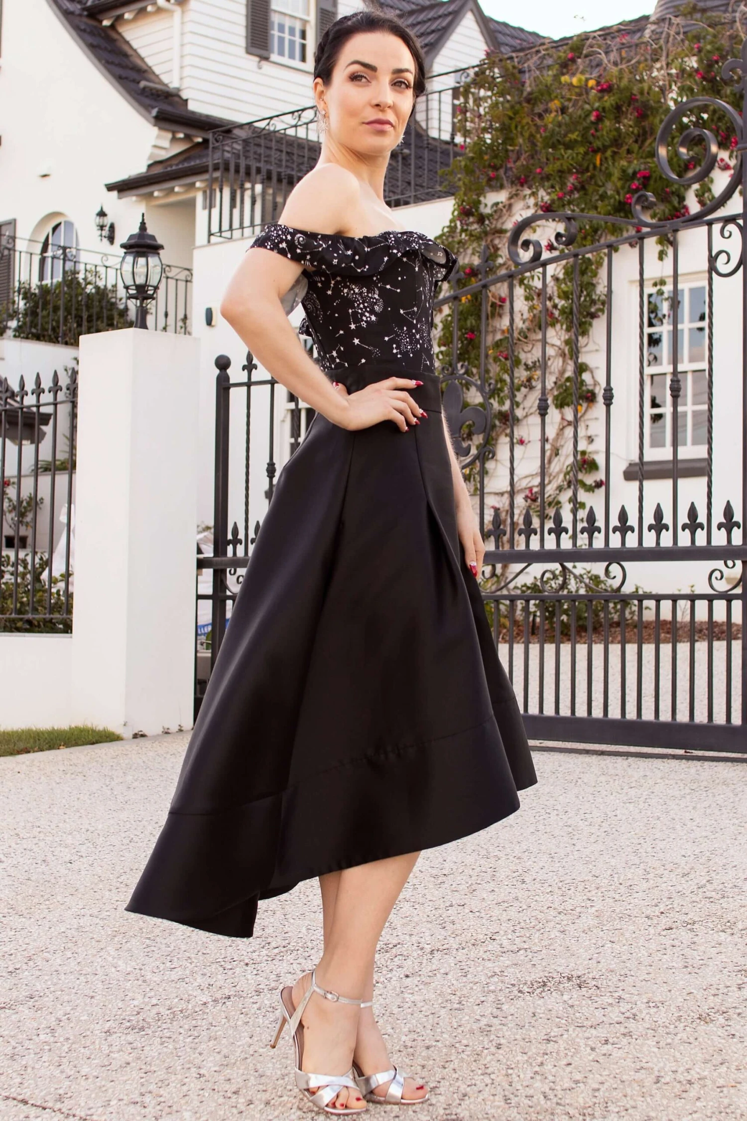Designed as outerwear, our cotton overbust corset comes in our popular black and white astronomy print, making it ideal for evening wear or outdoor festivals under the stars. With a strapless bustline, this instant shape corset top will give you a flattering waist reduction of up to two inches. The gathered frill on the bust carries on into elasticated off the shoulder sleeves in the same fabric.