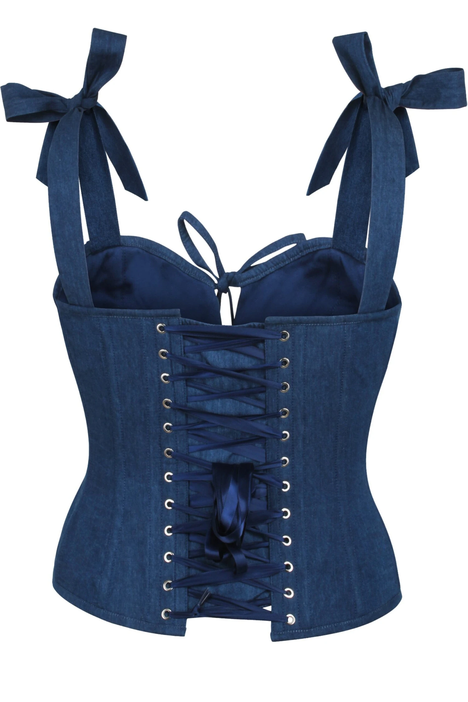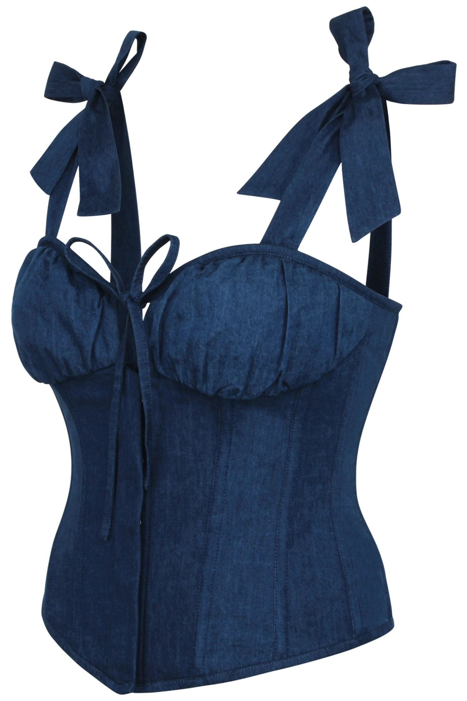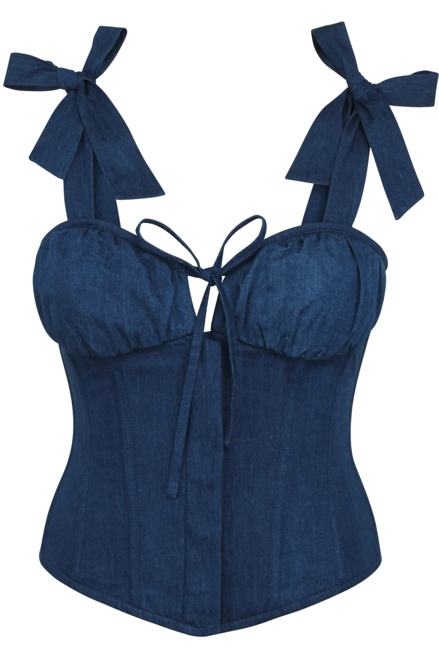 Everyone needs a denim shirt in their wardrobe and this is the corset version of that! An easy to wear, youthful corset top with adjustable tie straps. Wear it casually or dress up with one of our pretty skirts.
