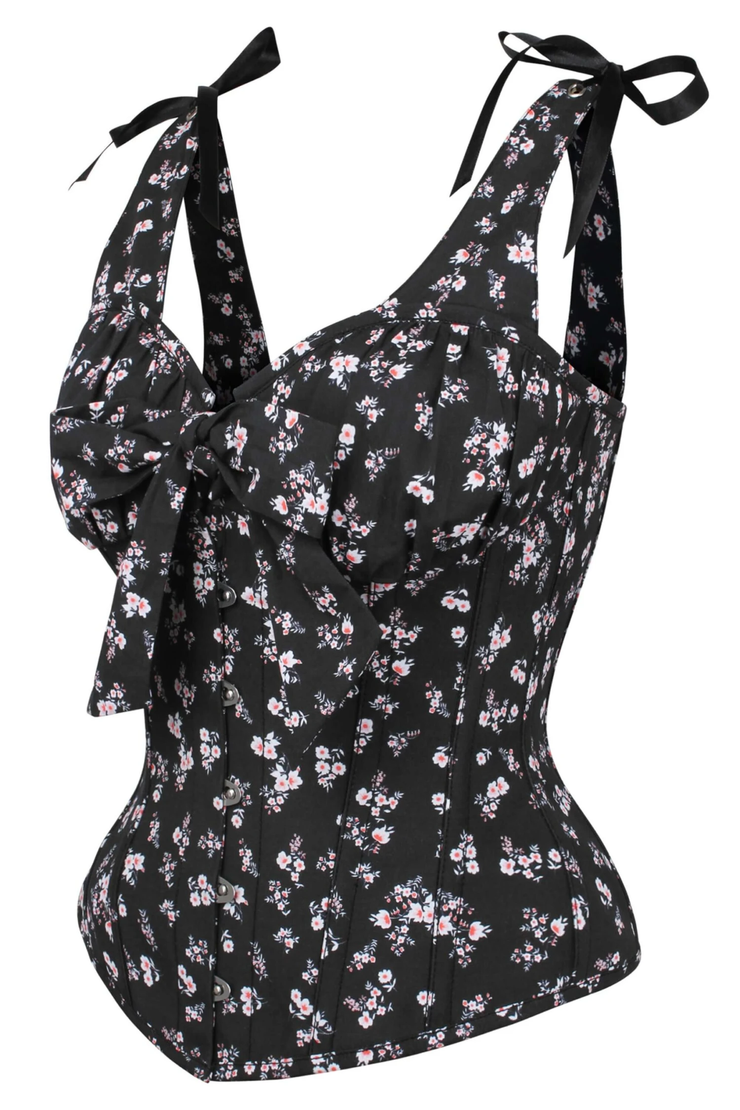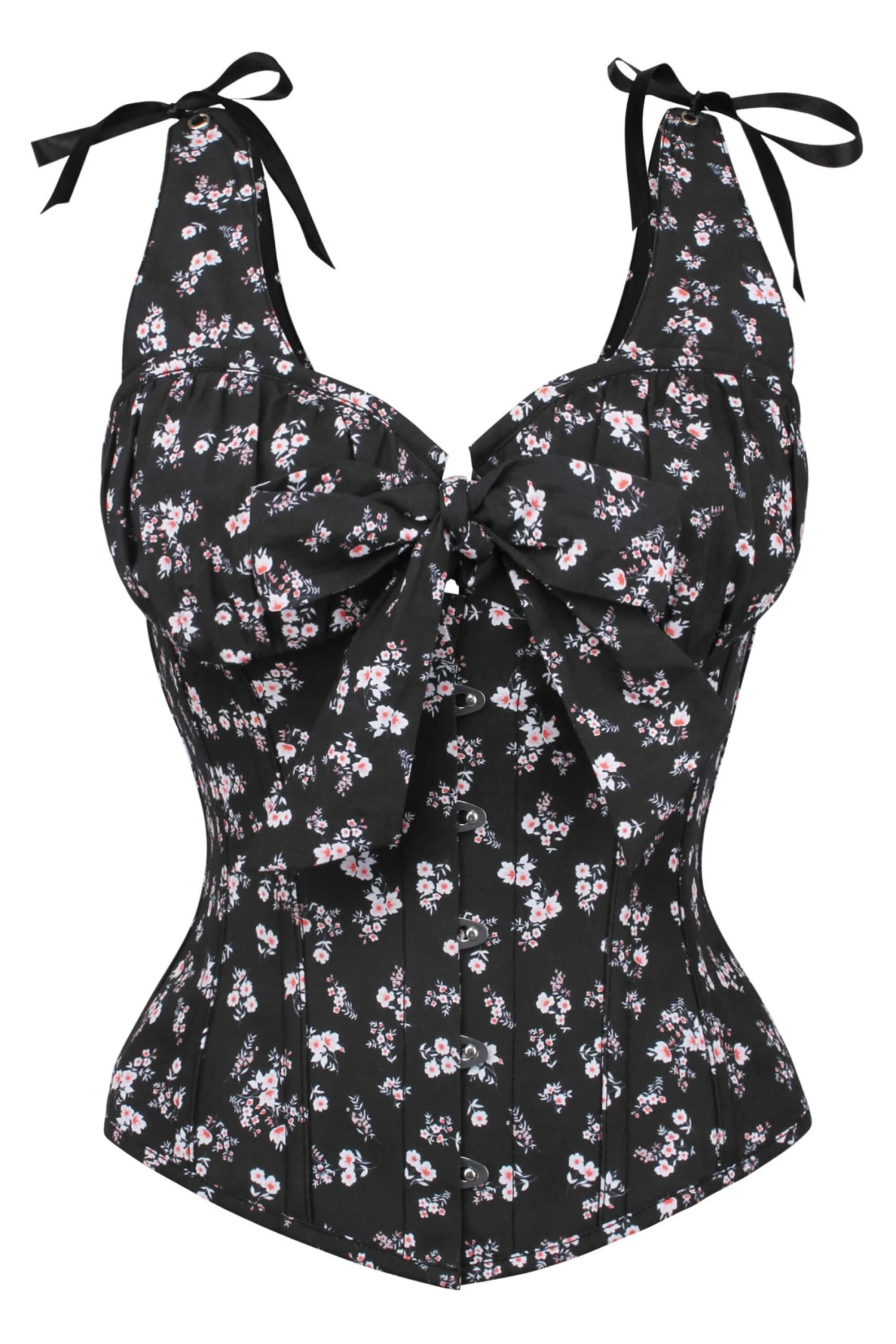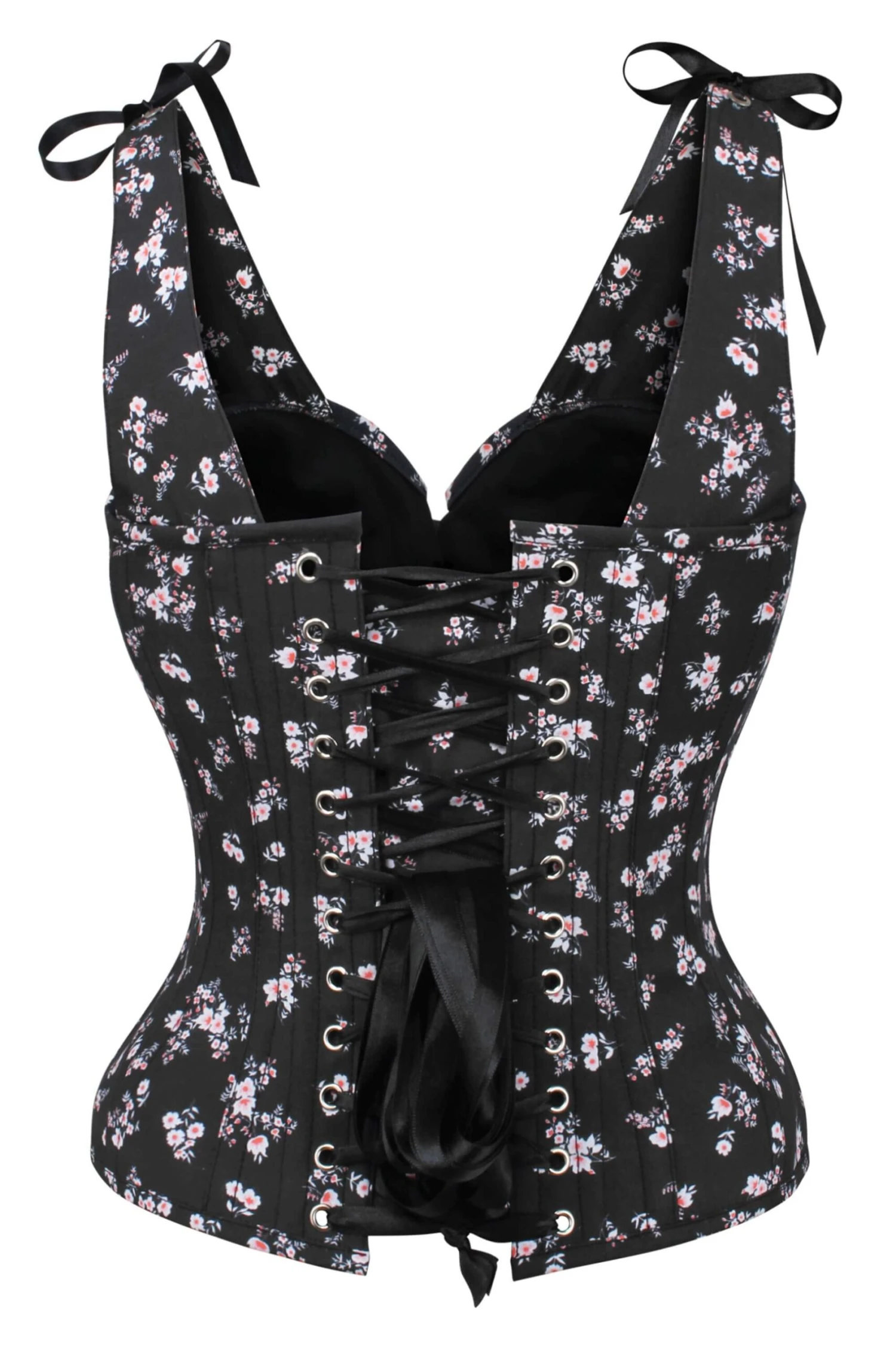 - Corset Design Features: Floral Print, Padded Cups, Tie Bust, Tie Straps