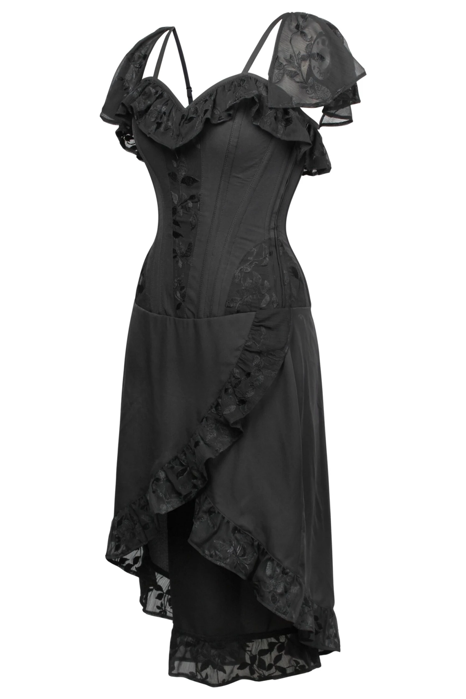 Embrace the night in this truly stunning corset dress. This gorgeous dress is beautifully cut with a Gothic flair. Mini bat wing sleeves with a floral pattern float off the shoulder, and the tight black skirt lined with soft voile frill offers nothing less than the prettiest expression of femininity. This corset dress opens at the side for ease, but still has traditional corset lacing at the back to help you achieve your ideal silhouette. Adjustable straps will also help ensure that you feel comfortable and secure. Don’t be fooled by the dark, charcoal colours of this dress: it’s a show stopping number that will light up any occasion.