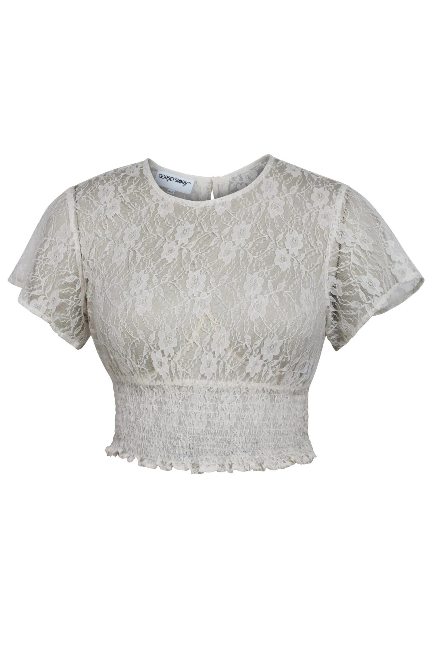 - Design Details: Shirred Waistband, Short Flutter Sleeves, Crew Neck