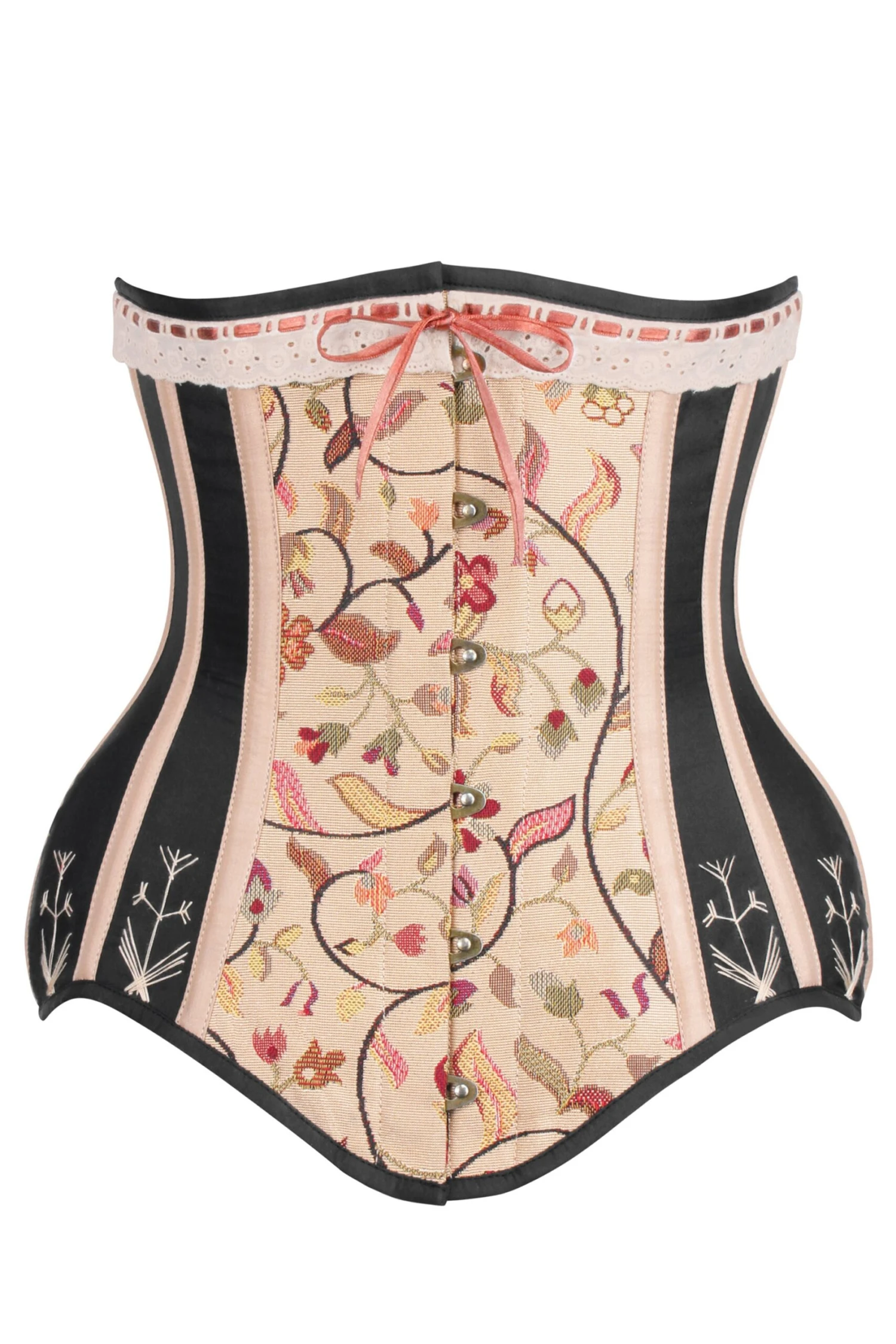 Add a touch of Renaissance glamour with our pretty as a picture underbust corset. The detailing is exquisite, with a pink brocade front panel and elaborate flossing at the side. The underbust border is trimmed with white lace threaded with pink satin ribbon, tied with a bow. The longline length flatters your tunny whilst providing a waist reduction of up to four inches.