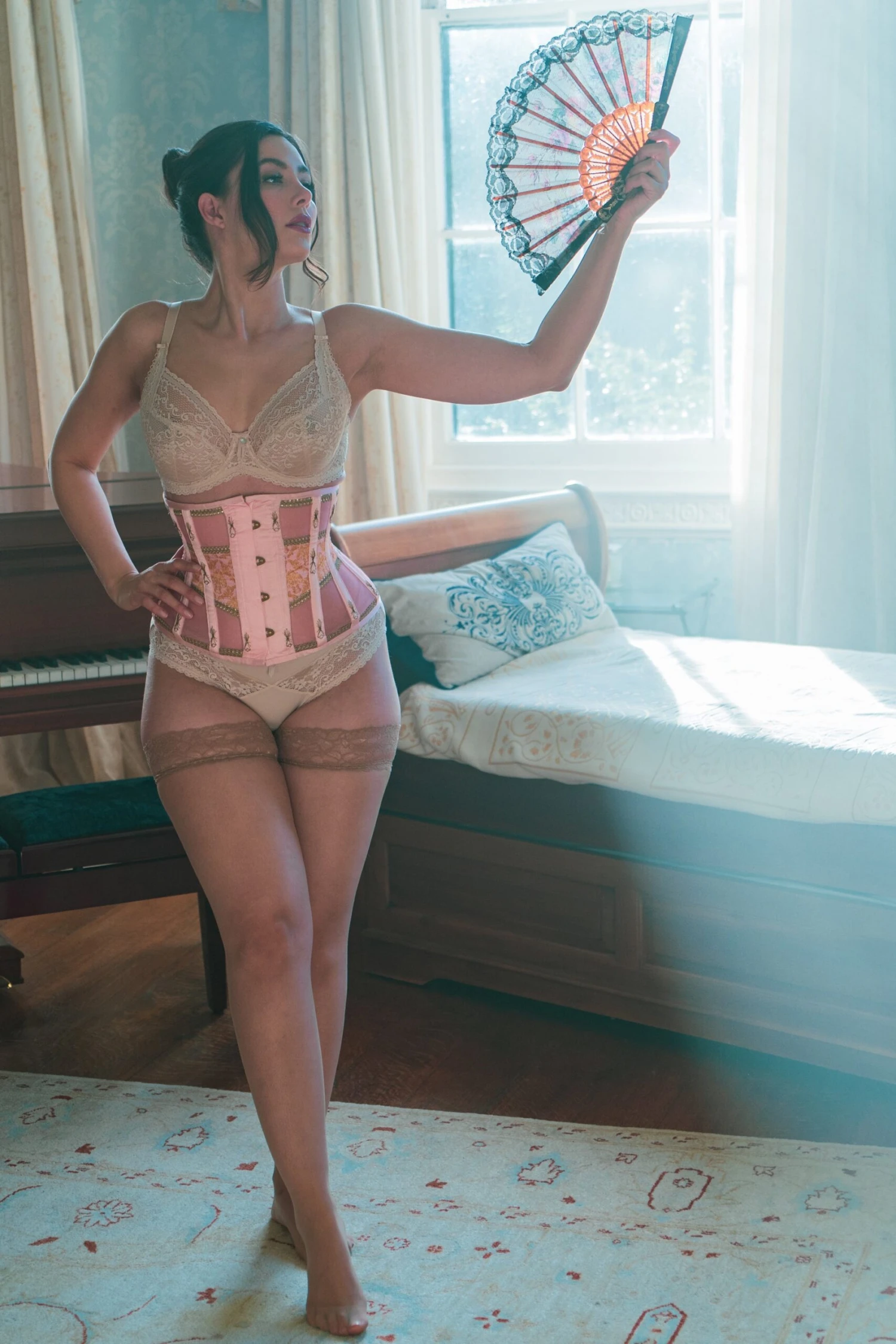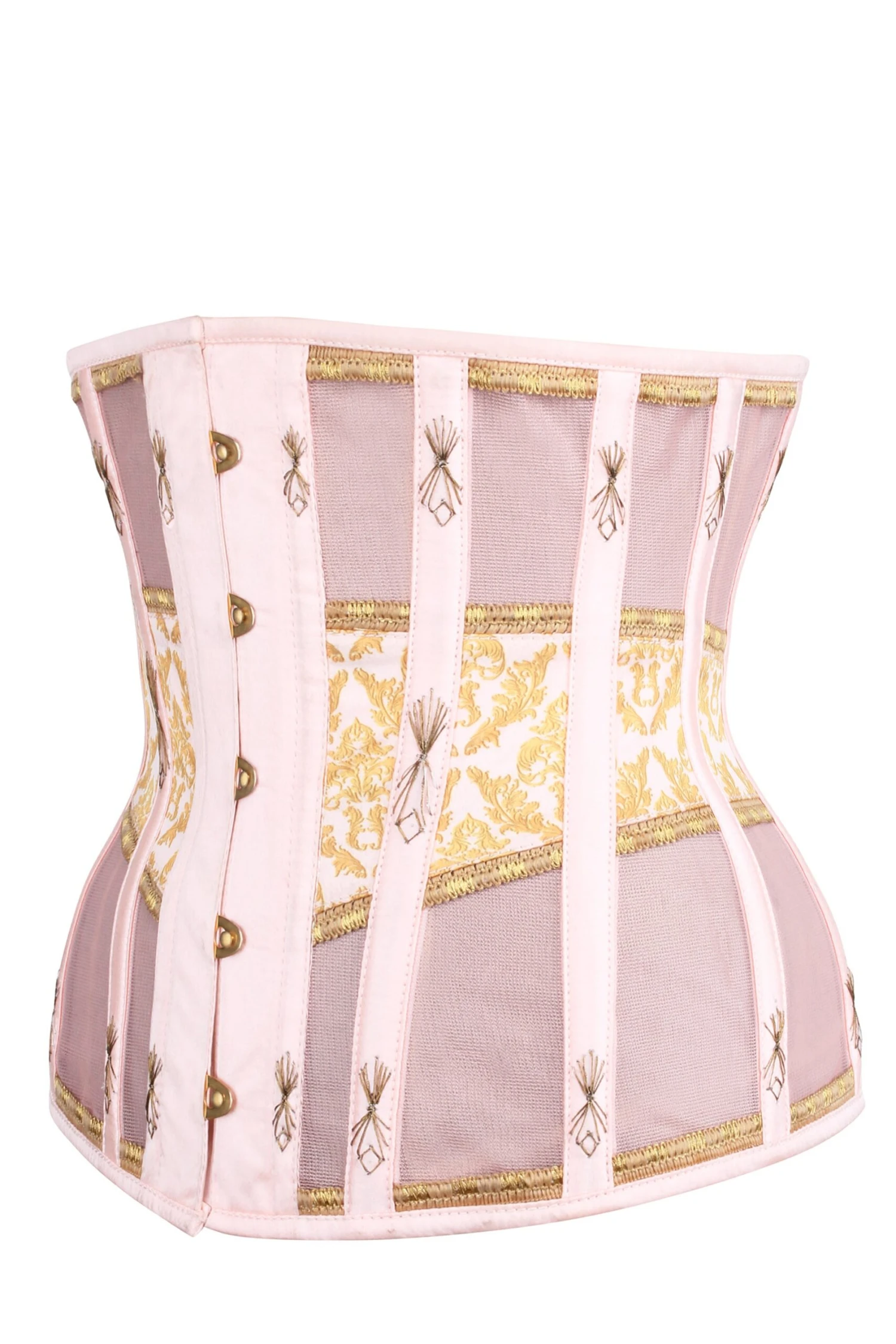 There’s more than a touch of the decadent Belle Epoque about this historically inspired design. This exquisitely detailed underbust corset offers a flattering waist reduction of up to four inches. In glorious peach satin with a gold damask waist and matching satin ribbon bows, the bodice is abundant with feminine touches that will make you feel beautiful when wearing it. Intricate flossing details feature over the seams in finest gold thread. Ribbons at the back will ensure the perfect custom fit and a back view of glossy satin. Perfect for cos play or honeymoons, this sensational design is sure to bring out your inner romantic.