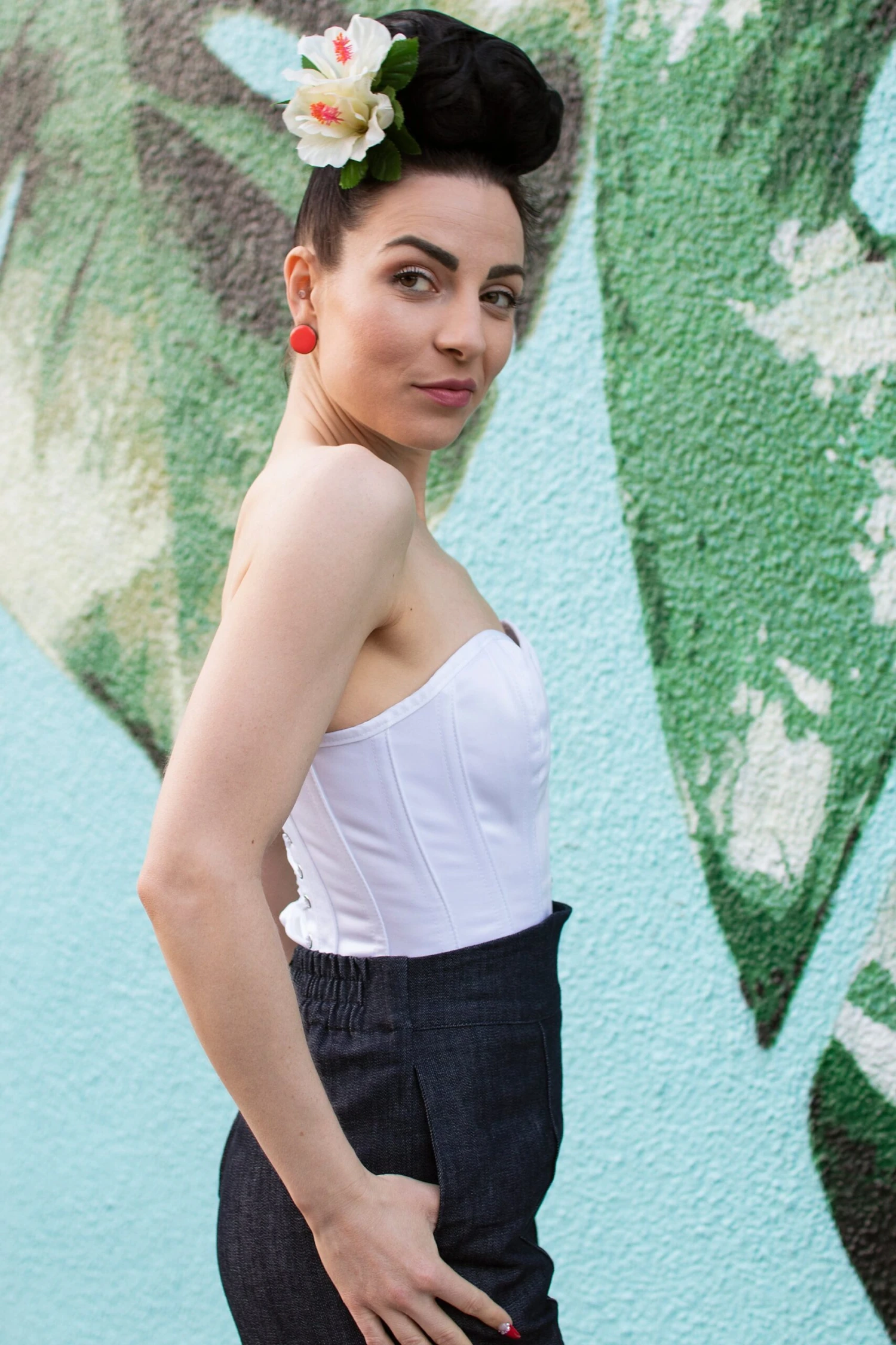A bright matte white satin overbust corset perfect for alternative bridal wear or an everyday outfit. It can be worn underneath clothing or as an elegant summer top. For a modern summer look, wear with a light coloured flowing skirt or even a smart pair of jeans. Lightweight bones, a narrower busk and pretty satin ribbon are key to achieving a smaller waist by up to 2″ a whole dress size slimmer. Shaping in the bust so no need to wear a bra. Love your new hourglass figure; Instant Shape is ideal for first time corset wearers.