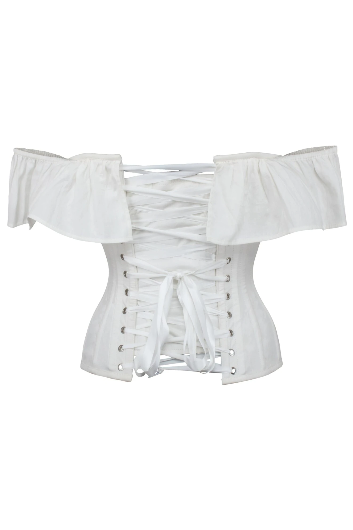We all need a classic white tee in our wardrobe and we, at Corset Story, think you also need a classic white corset top! A beautiful and simple white bardot frill gives this overbust corset some added ‘extra’. Pretty ribbon, fully adjustable lacing and a concealed front zip means you will achieve the perfect fit with ease. Add our Dahlia Strap for extra support.