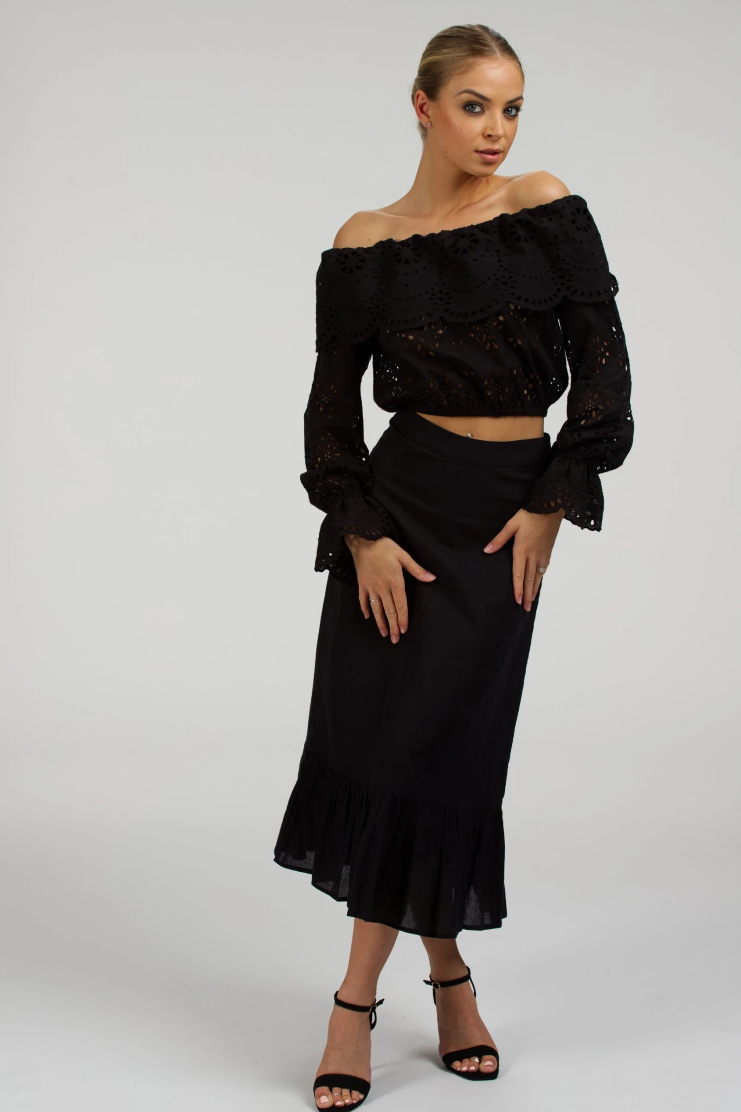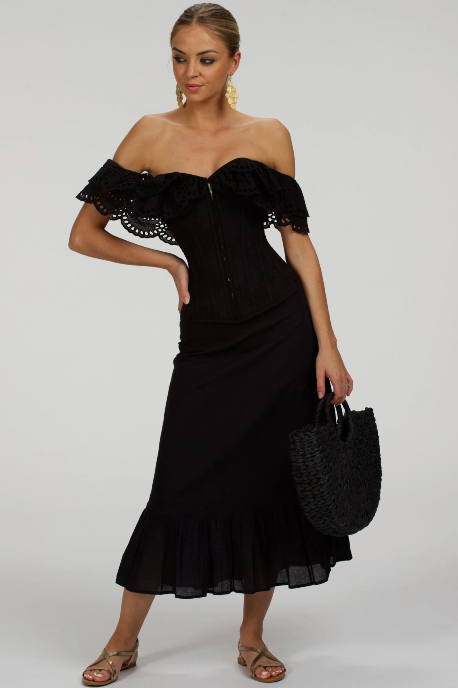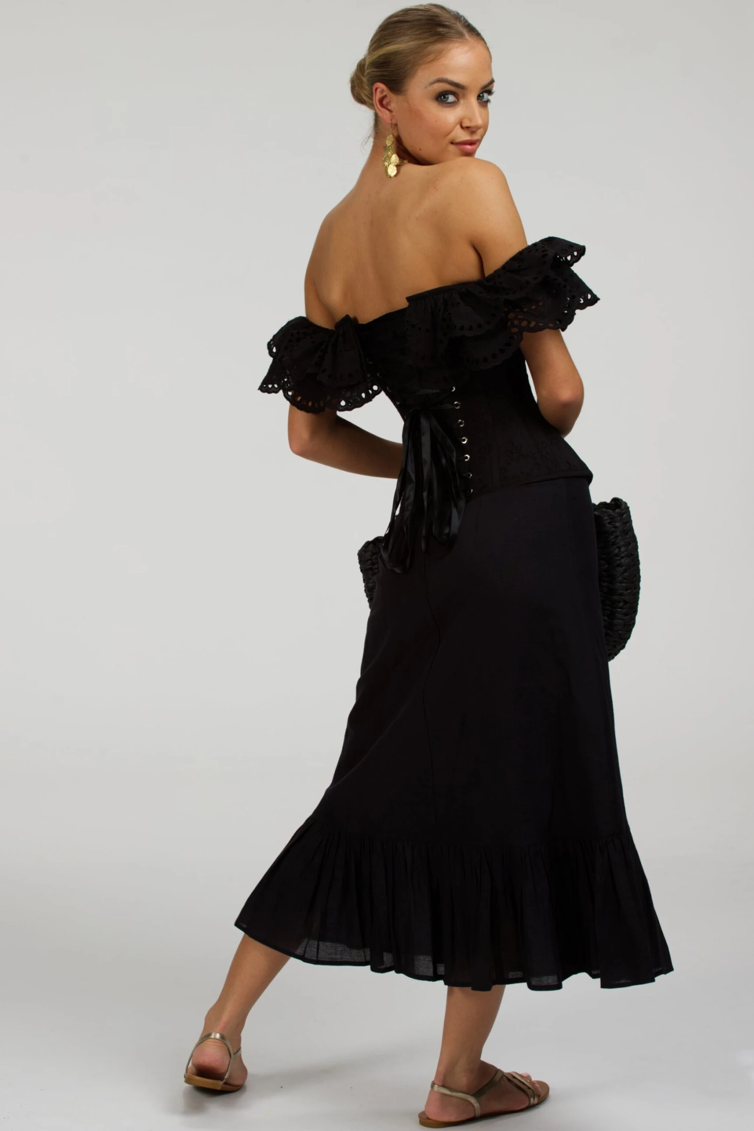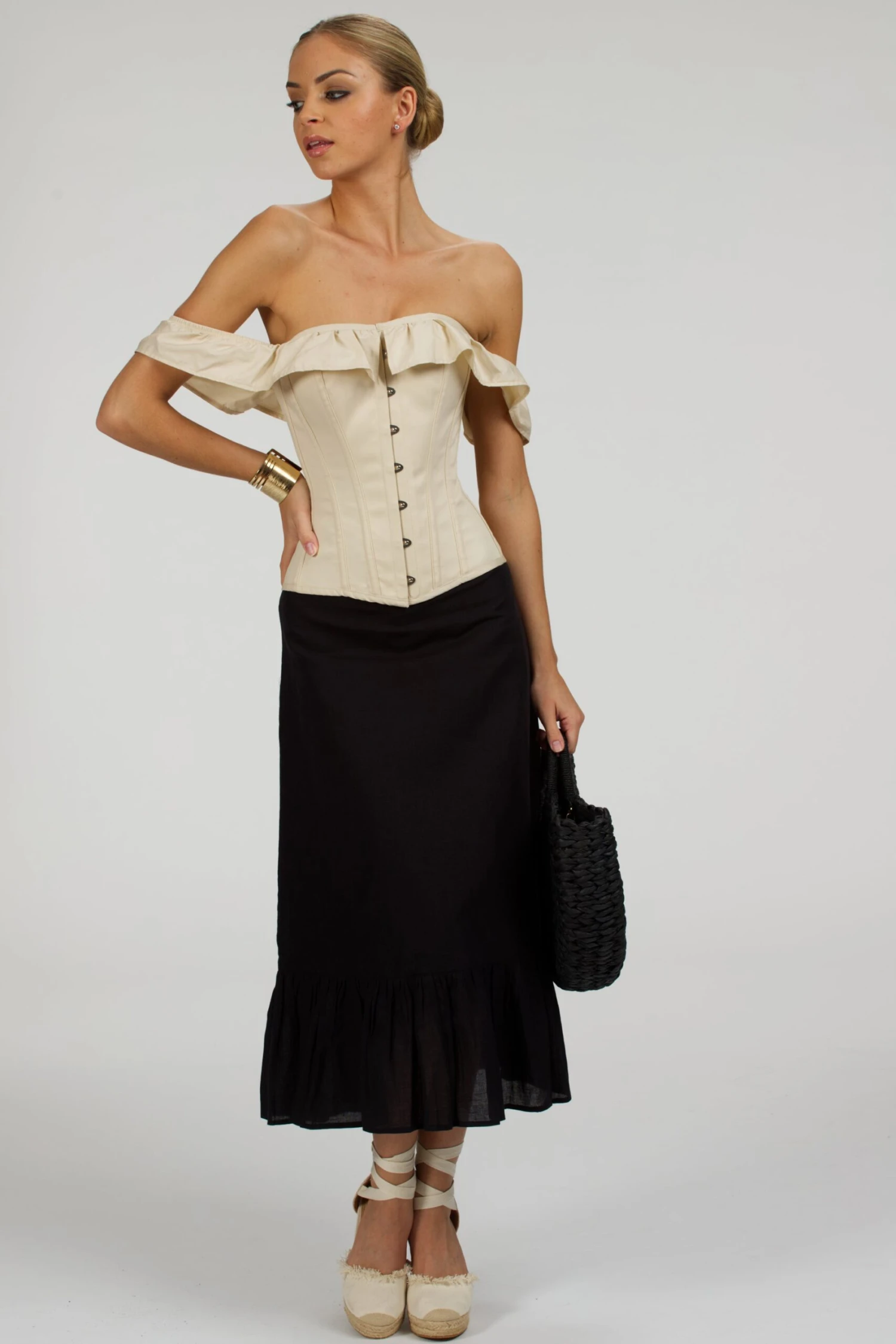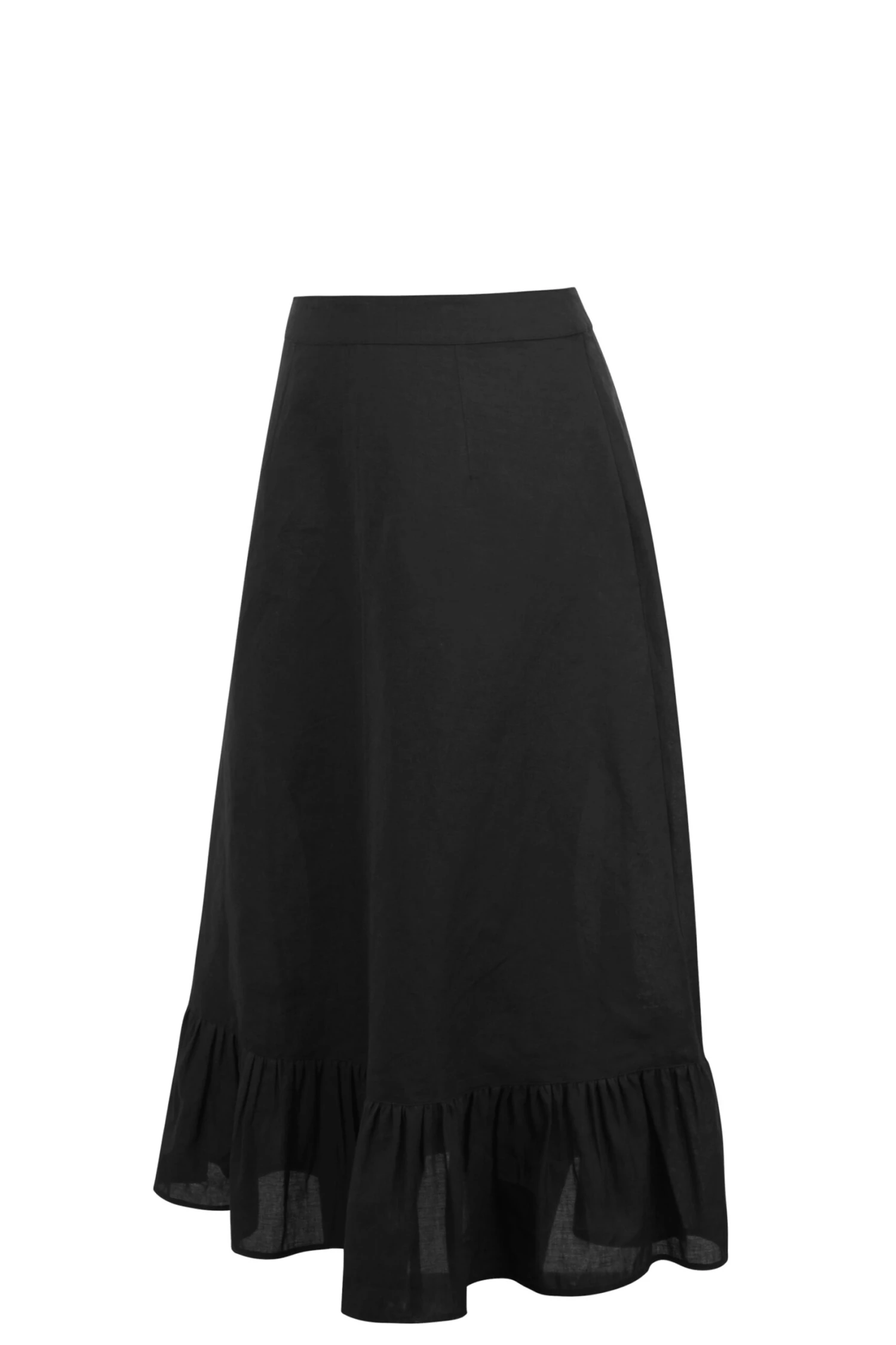 A timeless, lined, black linen blend skirt with deep frill hem. The Olive skirt is designed to be worn with our Fern cropped top but it is also the perfect companion for our regular overbust corsets.