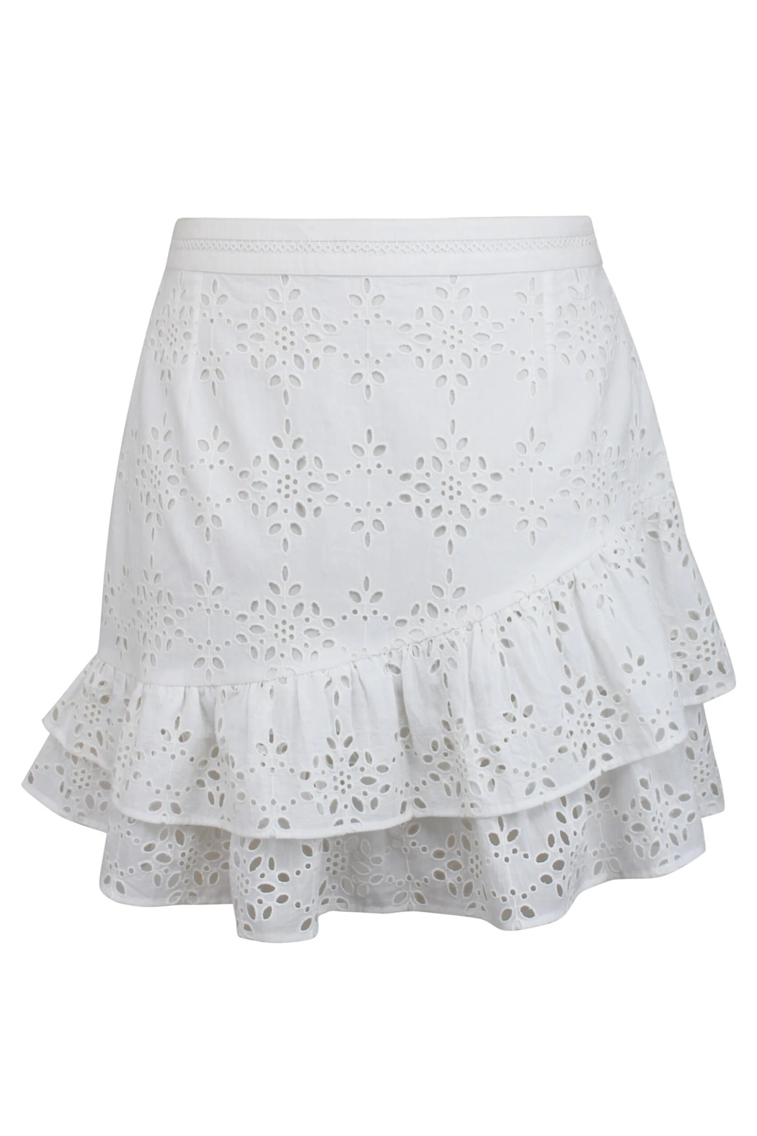 Sammy in white broderie anglaise is the perfect summer skirt. Featuring a double frill hem and intricate waist band detailing it will be in your wardrobe for years to come. Wear it with our other broderie anglaise pieces and create the dream co-ord.