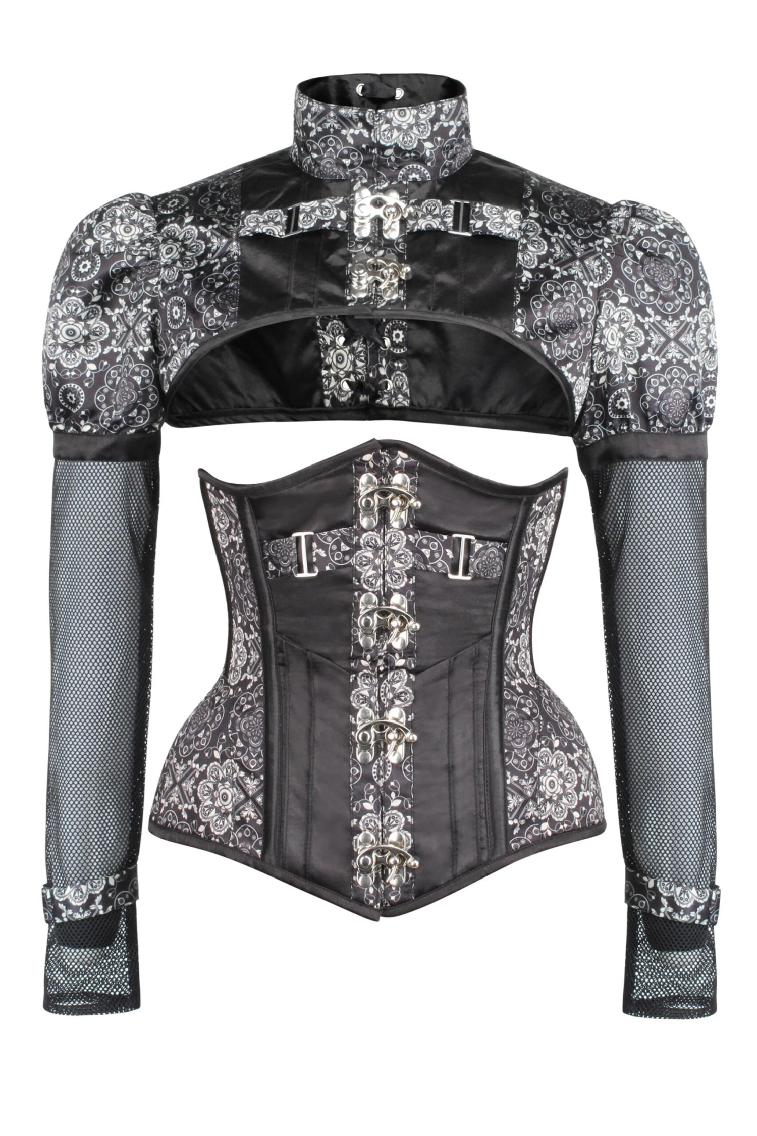All eyes will be on you when you wear our showstopper Steampunk two piece. The underbust corset features a floral repeat motif in black and white, whilst satin panels feature up front, trimmed with gleaming silver buckles. The design is carried on in the matching cropped bolero, which has a buckled high neck, and black mesh sleeves with fabric trim. The corset provides a waist reduction of up to four inches. Simply add the bra of your choice.