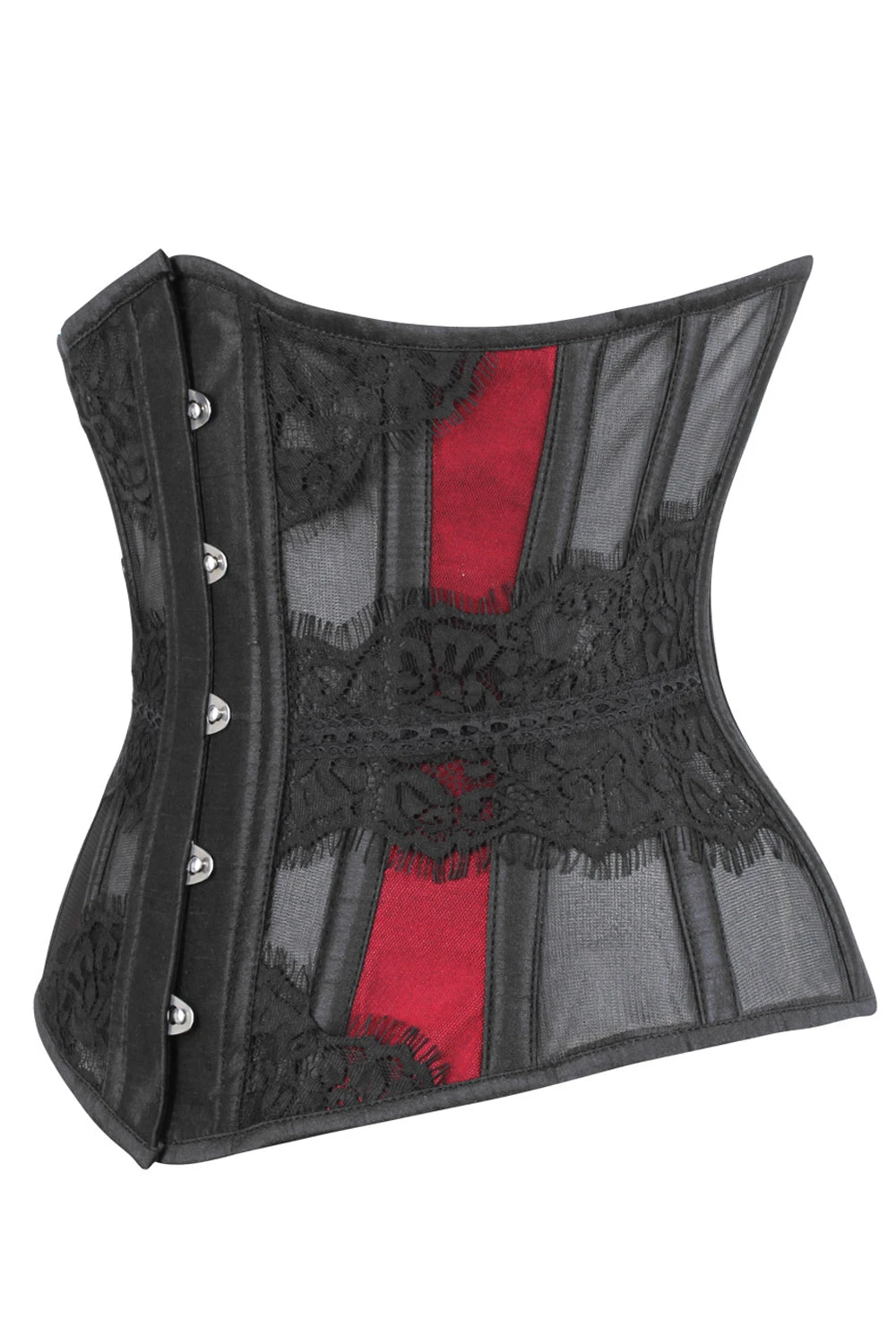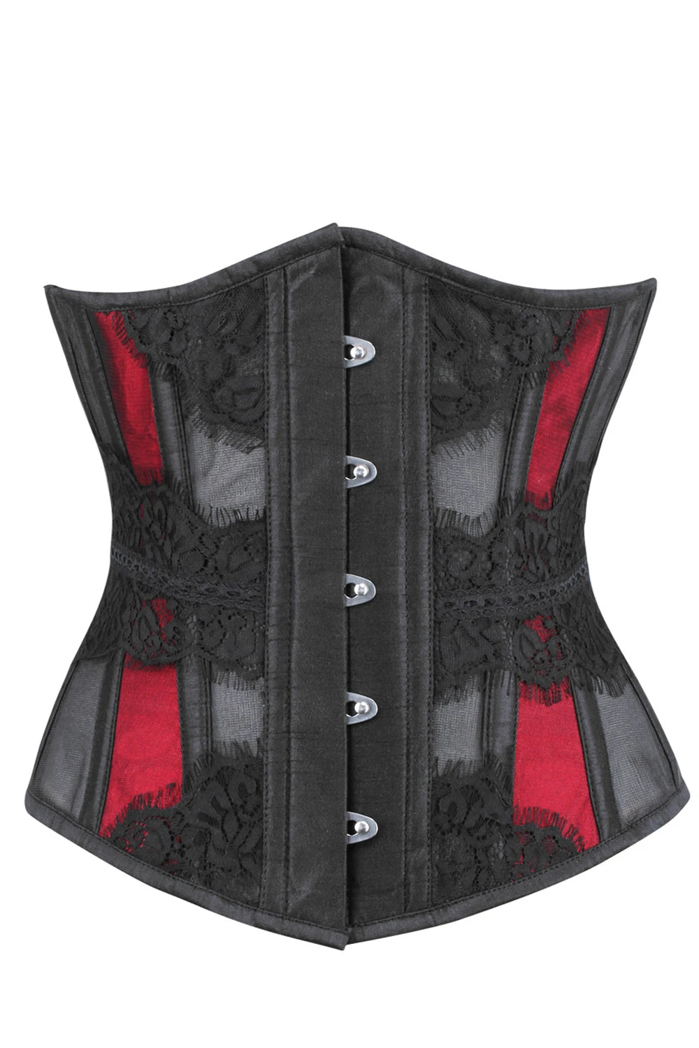 In dramatic red and black, our under bust lace and mesh corset offers a waist reduction of up to three to four inches. With glamorous black lace edging and a lightweight feel, this makes for the perfect lingerie secret under your outfit. Irresistibly feminine touches are featured with silky black ribbons contrasting with the red and black panels of the corset. The ribbon lacing gives an adjustable custom fit at the bust, waist and hips for shape and comfort.